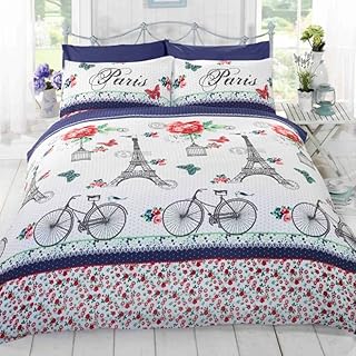 (King Size) - Homespace Direct C'Est La Vie Paris Duvet Cover Quilt Bedding Set, Blue Flowers, Butterflies, Pink, Eiffel Tower, Bicycles King Size