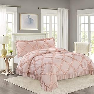 HIG 3ピース クイーン ダイヤモンド ラッフル シャビー シック スタイル フェミニン ブラッシュ掛け布団セット 枕カバー2枚付き - 100%パステルマイクロファイバー - 4インチ ハンドメイド フリルエッジ - 軽量 & 通気性 - ふわふわ 快適 暖か (カンタ)