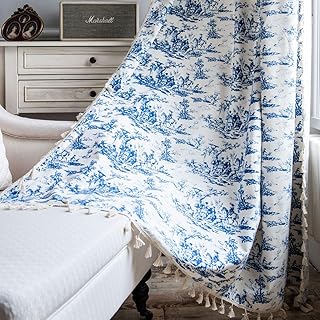 vctops ボーホー プリント コットン リネン ウィンドウ カーテン パネル タッセル アメリカンカントリースタイル 部屋を暗くするカーテンパネル 寝室 リビングルーム 1枚 (59インチ x 87インチ、ブルー)