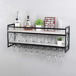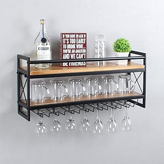 MBQQ ワインラック 脚付きグラスラック 工業用2段木製棚 30インチ 壁掛けワインラック 7本のステムグラスホルダー付き ワイングラス/マグカップ/ホームデコレーション/レトロブラック