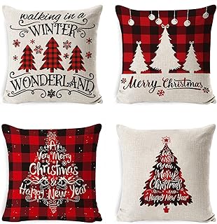 D-FantiX クリスマス枕カバー 4点セット 18 x 18インチ クリスマス枕カバー 格子柄リネンクッション 装飾用クッションカバー 正方形枕カバー ホームオフィス リビングルーム クリスマス装飾