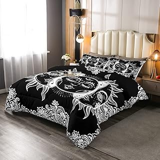 Sun And Moon 掛け布団セット クイーンサイズ ボーホー エキゾチックスタイル キルト風掛け布団 大人 女性 ティーン ブラック ホワイト ボヘミアン 曼荼羅 装飾 ダウン掛け布団 ボヘミアン ボタニカル 花柄 ソフト羽毛布団 インサート