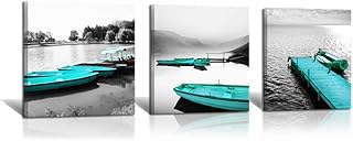 3ピース ブラック ホワイト ティール キャンバス 壁装飾 ターコイズ 霧 湖 風景画 ティールブルー ボート 絵 ミスティ ネイチャー ポスター プリント フレーム 寝室 バスルーム キッチン 壁装飾 12インチ x 12インチ x 3インチ