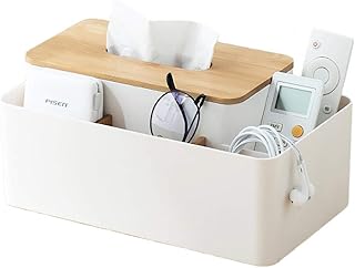 TINKSKY リモコンラック ティッシュ収納ボックス 卓上収納 小物入れ 分格設計 おしゃれ 多機能収納ケース 木蓋付き(ホワイト)